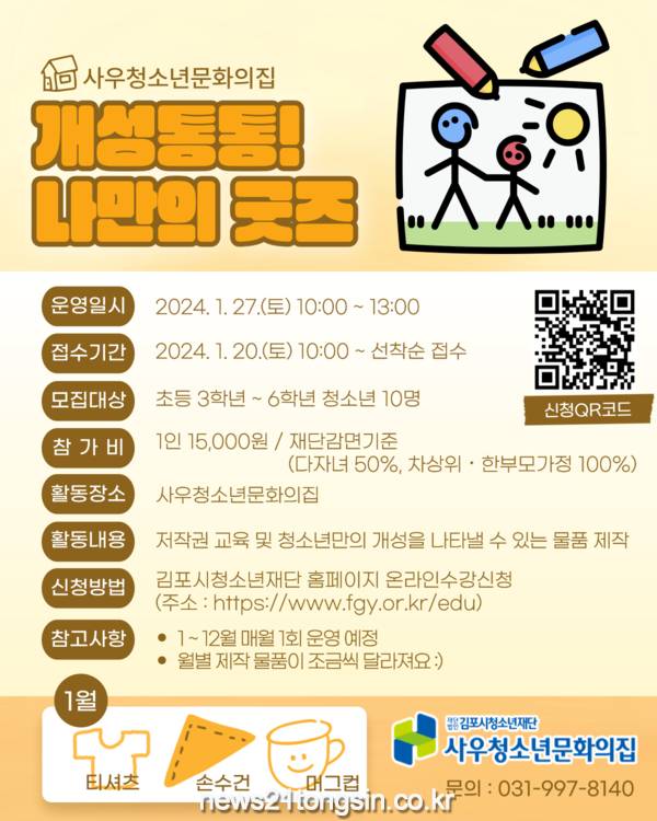본 프로그램은 1월~12월 매월 1회 연간으로 나아가며, 매월 청소년들의 제작 물품이 다양하게 경신되고, 1월 운영은 27일 오전 10시부터 13시까지 관리되며, 저작권 교육, 내가 만든 굿즈와 저작권의 관계 이해, 굿즈의 정의 이해, 나만의 굿즈 만들기로 짜여, 굿즈 3종(티셔츠/손수건 /머그컵)체험 활동이 공급된다.