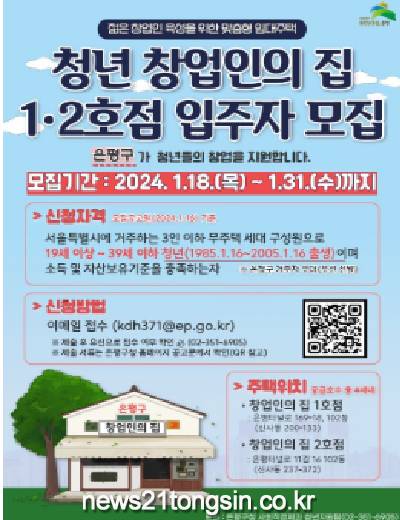 서울 은평구가 오는 31일까지 청년 창업인 육성과 창업 성장 근거 조성을 위한 맞춤형 공공임대주택 '청년 창업인의 집' 입주자를 모은다.