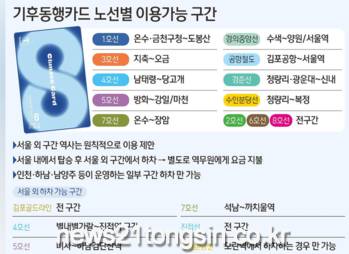 단, 버스의 경우 서울시 면허버스는 서울지역 외에서 타고 내리더라도 기후동행카드를 쓸 수 있다. 승하차문 등에 ‘기후동행카드 사용가능 노선’이라는 팻말을 붙인 버스는 안심하고 타도 된다.