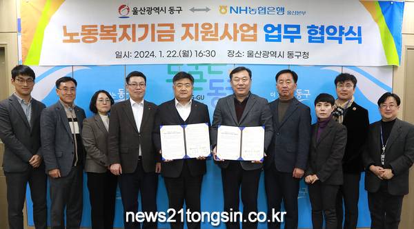 (뉴스21통신/임정훈기자) = 울산시 동구청은 1월 22일 오후 4시30분 구청장실에서 NH 농협은행 울산본부 관계자들이 참석한 가운데 노동복지기금 지원 사업에 대한 업무 협약식을 가졌다.