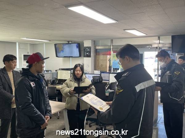 (뉴스21통신/우정석기자) = 울산해양경찰서(서장 정욱한)는 24일 오후, 술에 취해 바다에 빠진 익수자를 직접 입수해 생명을 구한 외국인 선원 리얀토(30대, 인도네시아)씨에게 감사장을 수여했다.