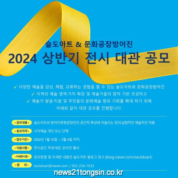 (뉴스21통신/임정훈기자) = 울산 동구 슬도아트가 1월 16일부터 2월 4일까지 ‘2024년 상반기 대관공모사업’ 참여자를 모집한다.