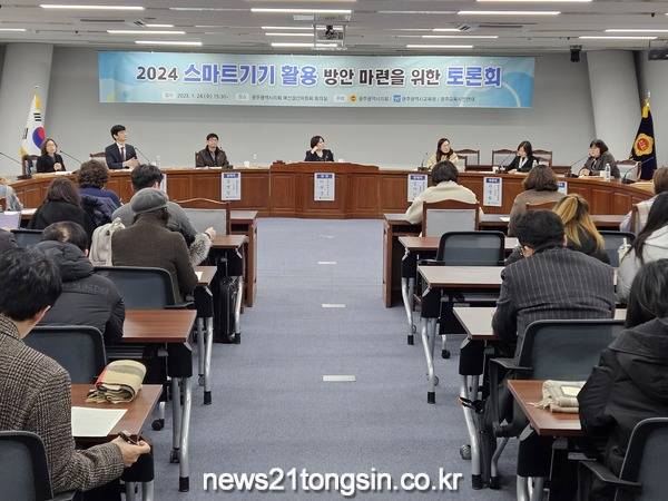 [뉴스21통신/장병기 기자] 광주시교육청이 지난 24일 광주시의회 및 광주교육시민연대와 공동으로 시의회 예산결산특별위원회 회의실에서 ‘2024 스마트기기 활동 방안 마련을 위한 토론회’를 개최했다.