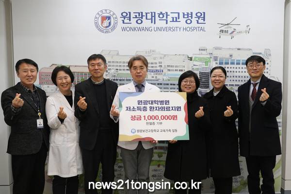 익산시에 위치한 원광보건고등학교 관계자들이 지난 24일 전북권역 상급종합병원인 원광대학교병원(병원장 서일영)을 방문, 5층 회의실에서 기부금 1백만원과 헌혈증서 260여장을 전달했다.