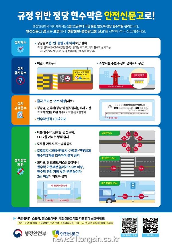 보행자와 차량 운전자 시야를 가릴 우려가 있는 교차로, 건널목, 버스정류장 주변은 현수막을 2.5m 이상 높이로 설치해야 하고 다른 현수막과 신호기, 안전표지를 가리면 안 된다.