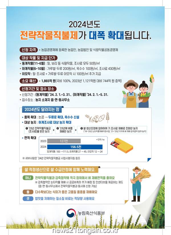 전략작물 직불제는 논 이용률 제고, 농업 소득 안정 등을 위해 논에 동계작물 또는 하계작물을 재배하면 지원하는 사업이다. 동계작물 밀, 보리, 조사료를 재배하면 50만 원/㏊, 하계작물 논콩, 가루쌀은 200만 원/㏊, 식용 옥수수 100만 원/㏊, 하계 조사료는 430만 원/㏊을 지급한다.