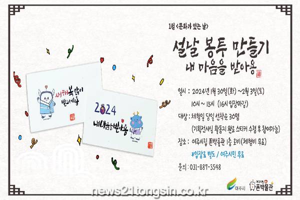 여주시 여주시립 폰박물관에서는 2024년도 1월 경기도 문화의 날을 맞이하여 오늘(30일)부터 2월 3일까지 태블릿으로 '설날 봉투 만들기' 체험을 경영한다.