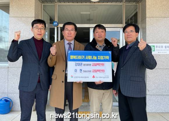 [뉴스21통신 박찬웅기자] 강진군 신전면 지역사회보장협의체 강대권 위원과 노해마을 한솔농장 대표 이현 씨가 지난 29일 ‘행복더하기 사랑나눔 지정기탁’에 참여해 각 100만 원을 기부, 지역사회에 온정을 전했다.