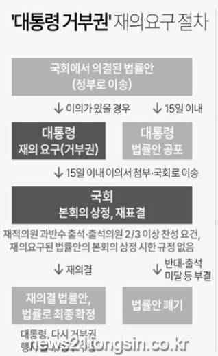 재의요구 시한인 다음 달 3일을 나흘 앞두고 윤 대통령이 거부권을 행사함에 따라, 정부는 해당 법안을 국회로 돌려보내 재의결을 요구하게 된다.