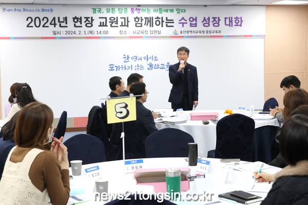 울산교육청은 1일 시교육청 집현실에서 중·고등학교 교장, 교사, 교육전문직 등 60명이 참석한 가운데 ‘2024년 현장 교원과 함께하는 수업 성장 대화’를 열었다.