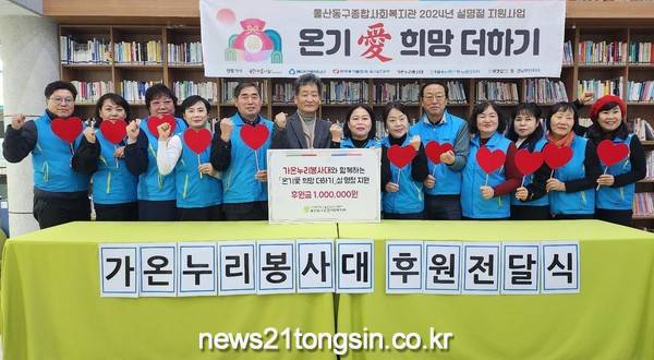 (뉴스21통신/임정훈기자) = 지역 주민들로 구성된 봉사모임인 가온누리봉사대(회장 이선미)는 지난 1월 30일 오후 6시 울산동구종합사회복지관(관장 한영섭)을 방문하여 설을 맞아 어려운 이웃들이 따뜻한 명절을 보낼 수 있도록 돕고자 후원금 100만원을 전달했다.