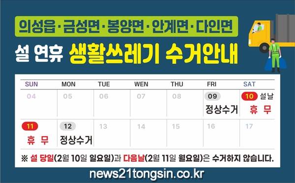 군은 쓰레기 수집·운반 대행 지역(의성읍, 금성·봉양·안계·다인면)의 경우 연휴 중 설 당일(2월 10일)과 일요일(2월 11일)에만 쓰레기를 수거하지 않고, 그 외 기간은 평소처럼 정상 수거하며, 연휴 전후로 생활폐기물 요일·성상별 배출제와 상관없이 일괄 수거하여 깨끗한 거리를 조성할 계획이다. 대행 지역인 5개 지역을 제외한 나머지 13개 면에서는 면 자체 일정에 따라 수거가 이루어질 예정이다.