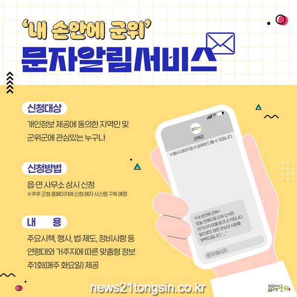 군위군이 지난 1월부터 실시한 ‘내 손안에 군위’ 문자알림서비스는 주민들이 알아야 할 군정 소식과 주요 행사 등을 매주 화요일 문자로 전송해주는 적극 행정 서비스의 일환으로 지난해 12월 신청을 받은 이후 매주 천 명 넘게 신청자가 몰리면서 시행 1달 만에 5천 명을 넘겼다.