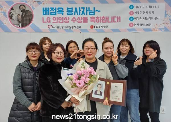 (뉴스21통신/임정훈기자) = 울산 동구에서 활동하는 자원봉사자 배점옥씨가 2월 5일 오늘오전 11시 울산동구자원봉사센터 회의실에서 ‘LG의인상’을 수상했다.