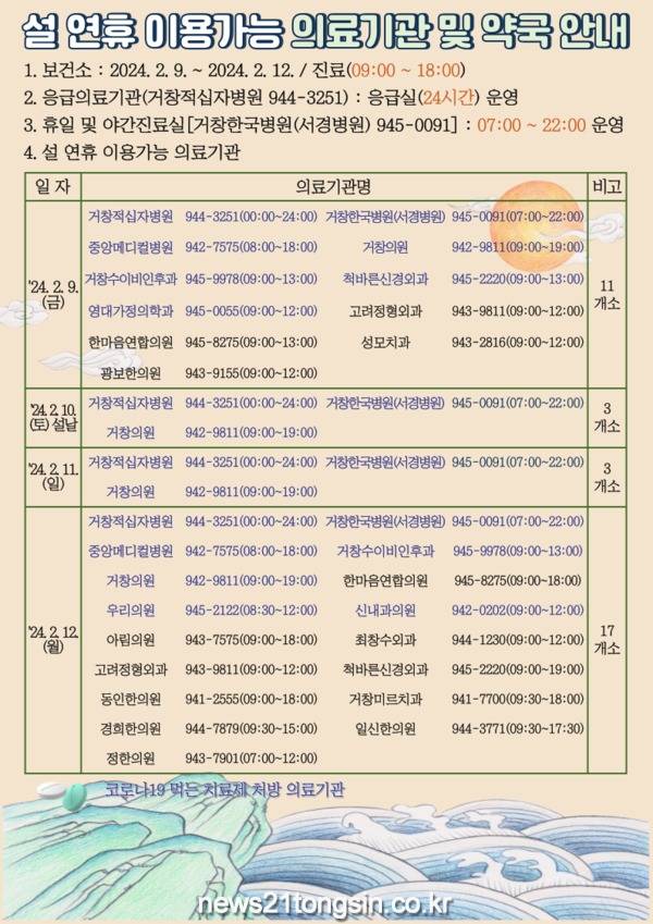 ‘설 연휴 문 여는 의료기관 및 약국 운영 세부일정‘은 응급의료지원센터 홈페이지(e-gen.or.kr), 스마트폰 어플 ‘응급의료정보제공’, 보건복지콜센터(☎129), 구급상황관리센터(☎119)를 통해 확인 가능하며, 거창군 누리집 등을 통해서도 알 수 있다.