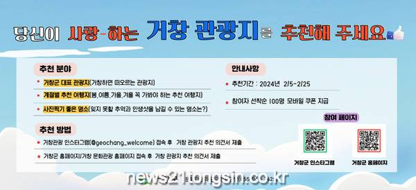 군 관계자는 “여행하기 좋은 관광도시 거창으로 거듭나기 위해 거창 대표관광지를 선정하고자 한다”며 “거창을 사랑하는 모든 분들께서 애정을 담아 여러분이 홍보하고 싶은 거창 관광지를 추천해주시길 바란다”고 말했다.