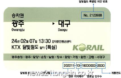 먼저, 승차권 일련번호인 ‘No.2123938’은 국회에 상정된 달빛철도특별법 의안번호를 상징한다. 또 맨 하단의 숫자열 ‘202211-10-18000000-2030’ 가운데 ‘202211’은 강 시장과 홍 시장이 광주광역시청에서 만나 달빛철도 조기 착공 등을 담은 달빛동맹 강화협약을 체결한 2022년 11월을 뜻한다. 이날은 쌍둥이 특별법으로 불리는 ‘공항특별법’과 ‘달빛철도특별법’ 제정은 물론 끈끈한 달빛동맹의 첫 단초가 됐다. 이어 ‘10’은 경유 지자체를, ‘18000000’은 1800만 영호남 지역민 인구를, 숫자열 끝의 ‘2030’은 달빛철도의 개통 연도를 의미한다. 승차권의 날짜는 이번 행사 일시를 새겼다.