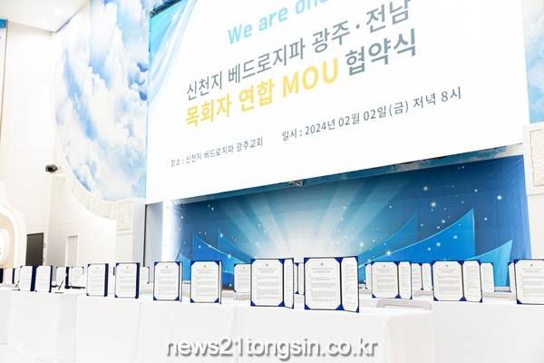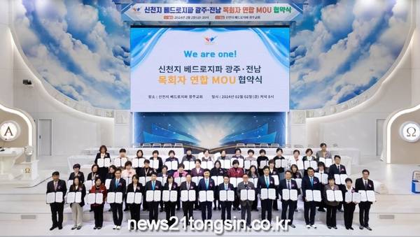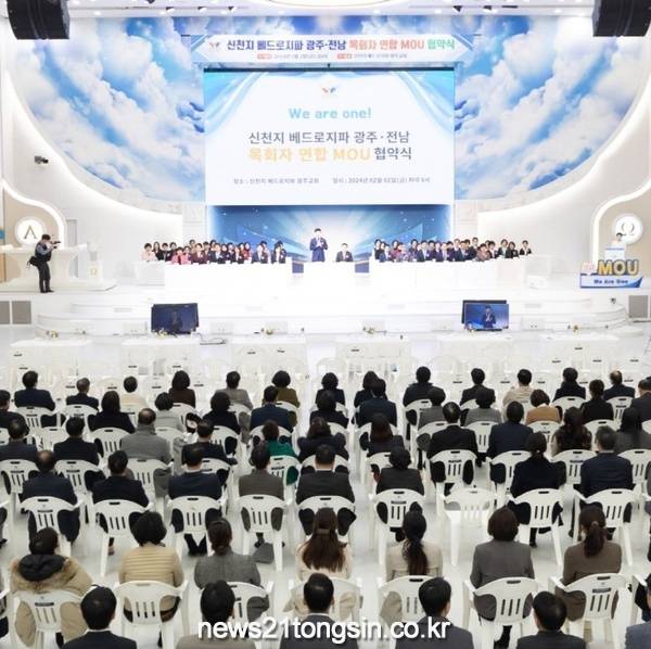 지난 2일 신천지 베드로지파 광주교회 성전에서 열린 ‘광주·전남 목회자 연합 MOU 협약식’에 광주·전남 지역 41개 교회의 목회자들이 복음교류와 주요업무 협약서에 동시에 서명했다고 7일 밝혔다.