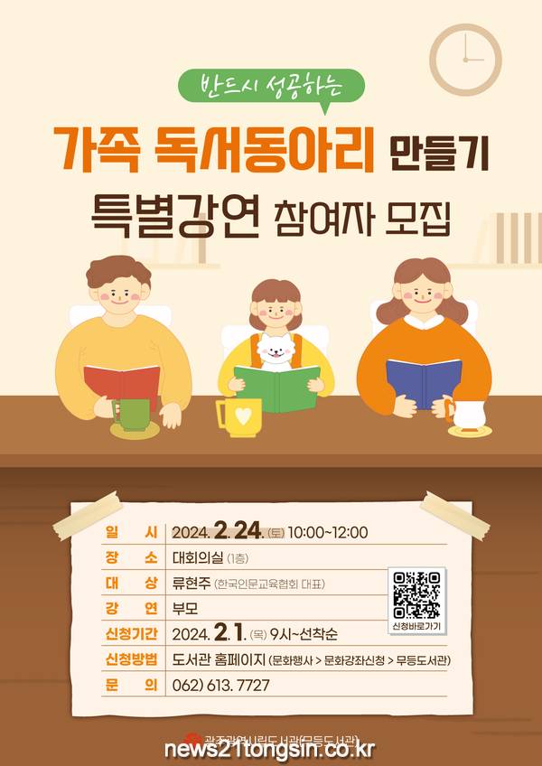 [뉴스21/장병기 기자] 광주광역시립무등도서관은 ‘반드시 성공하는 가족 독서동아리 만들기’ 특별강연을 오는 24일 오전 10시 무등도서관 대회의실에서 연다.