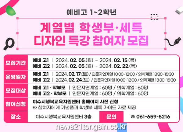 여수시행복교육지원센터에서 ▲2월 17일(토) 오전 예비 고1 인문․자연계열 ▲2월 17일(토) 오후 예비 고1 의학계열 ▲2월 24일(토) 오전 예비 고2 인문․자연계열 ▲2월 24일(토) 오후 예비 고2 의학계열 대상으로 진행된다.