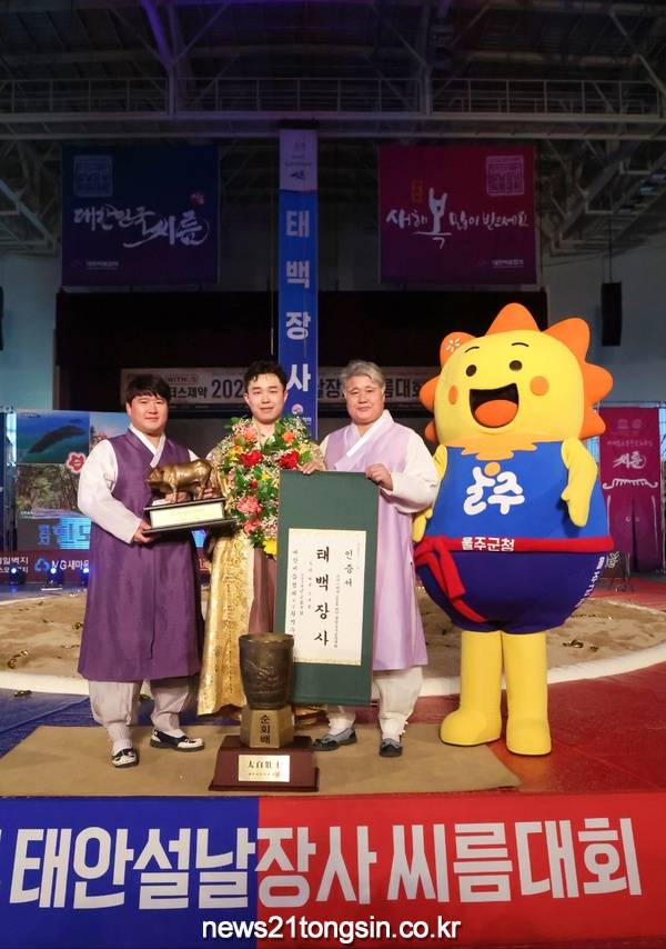 (뉴스21통신/우정석기자) = 울주군청 해뜨미씨름단 소속 이광석 선수가 지난 9일 충청남도 태안군 태안종합실내체육관에서 열린 ‘위더스제약 2024 태안설날장사씨름대회’ 태백장사(80kg 이하) 결정전에서 우승하며 개인 통산 3번째 황소트로피를 들어올렸다.