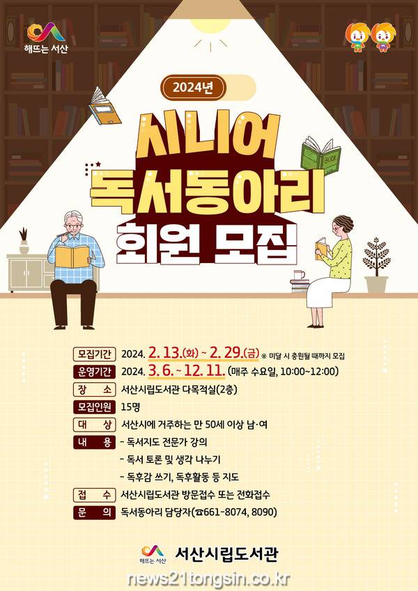 서산시립도서관에서 직접 운영하는 ‘시니어 독서동아리’는 만 50세 이상 시민으로 구성되며 3월 6일부터 시립도서관 다목적실에서 전문 강사와 함께 독서토론이 진행될 예정이다.