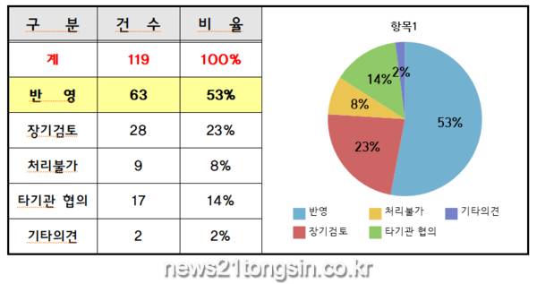 즉시 처리 21건을 포함해 연내 처리 가능한 사안은 총 57건(48%)으로, 양천구는 속도감 있게 추진해 행정 만족도를 높일 방침이며 주민 간 이해 상충, 법적 불가 등을 이유로 구에서 처리가 어려운 사항 9건(8%)에 대해서는 소관 부서의 재검토를 거쳐 지속 관리할 계획이다.