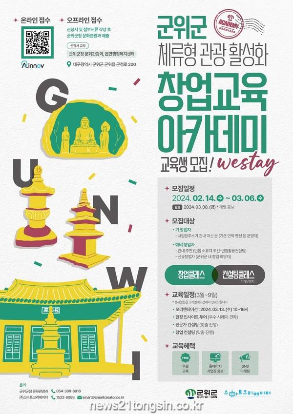 군위군은 체류형 관광 활성화를 위한 창업교육 아카데미 ‘위스테이(we stay)’ 교육생을 모집한다.