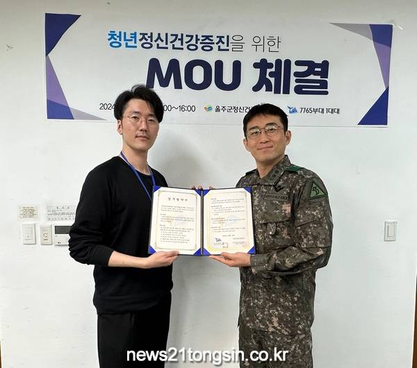 (뉴스21통신/우정석기자) = 울주군 정신건강복지센터가 16일 육군 제7765부대 1대대와 군 장병 및 예비군 정신건강을 위한 업무협약을 체결했다.