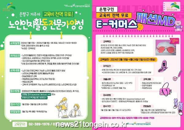 은평구는 올해 노인인지활동 전문가 양성과정, e-커머스 패션 MD 양성과정, 도배기능사 양성과정 총 3개의 교육훈련을 진행한다.