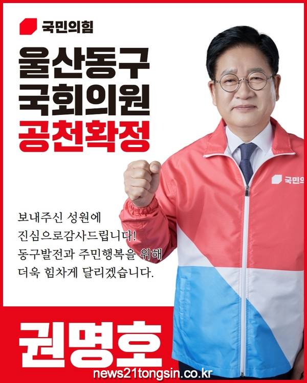 (뉴스21통신/임정훈기자) = 국회의원 권명호 의원 18일(일), 보도자료를 통해 제22대 국회의원 선거 울산 동구 지역구 국민의힘 후보로 공천이 확정된 것에 대해 “주민 여러분들께서 믿음으로 보내주신 성원에 반드시 승리로 보답할 것”이라고 말했다.
