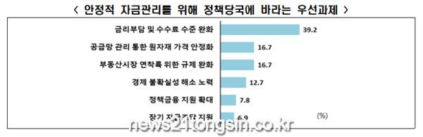 기업들은 안정적인 자금관리를 위한 정책과제로 ‣금리부담 및 수수료 수준 완화(39.2%), ‣공급망 관리를 통한 원자재 가격 안정화(16.7%), ‣부동산시장 연착륙을 위한 규제완화(16.7%) 등을 지목했다.