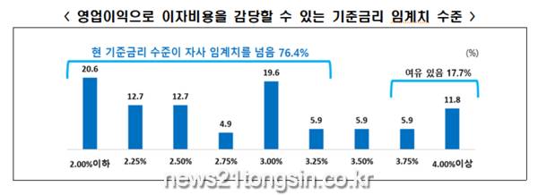 영업이익으로 이자비용을 감당할 수 있는 기준금리 임계치를 묻는 질문에서, 응답기업의 76.4%는 현재 기준금리 수준(3.50%)에서 이미 임계치를 넘었다고 응답했다. 현 기준금리 수준에서 여유가 있는 기업은 17.7%에 그쳤다.