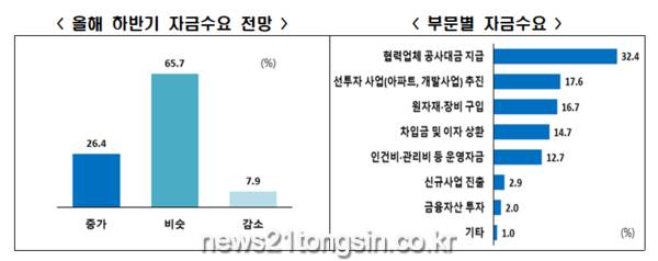 응답기업의 65.7%에 해당하는 기업들은 올해 하반기 기업들의 자금수요가 현재와 비슷할 것이라고 전망했으며, 자금수요가 늘어날 것으로 응답한 기업(26.4%)이 감소할 것으로 응답한 기업(7.9%)보다 3배 이상 많았다. 자금수요가 발생할 것으로 예상되는 부문은 ‘협력업체 공사대금 지급’(32.4%)이 가장 많았고, ‣선투자 사업 추진(17.6%), ‣원자재‧장비 구입(16.7%) 등의 순이었다.