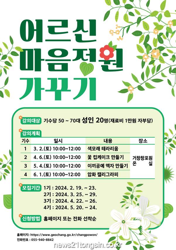 거창군은 거창창포원에서 3월부터 6월까지 50~70대 성인과 초등학생을 대상으로 '어르신 마음정원 가꾸기'와 '나는야 꼬마정원사'를 주제로 정원 체험 프로그램을 시행한다고 20일 밝혔다.