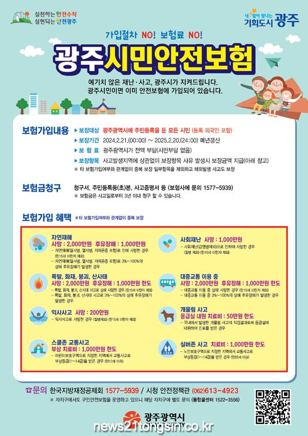 [뉴스21/장병기 기자] 광주광역시는 재난과 사고로 피해를 입은 시민의 신속한 일상회복을 지원하는 ‘광주시민안전보험’의 보장항목과 한도를 21일부터 확대한다.