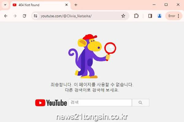 21일 오후 채널 소유주가 직접 계정을 삭제한 경우 나오는 안내 문장이 나왔다. 올리비아 나타샤 채널은 이날 오전까지만해도 접속이 가능했다.