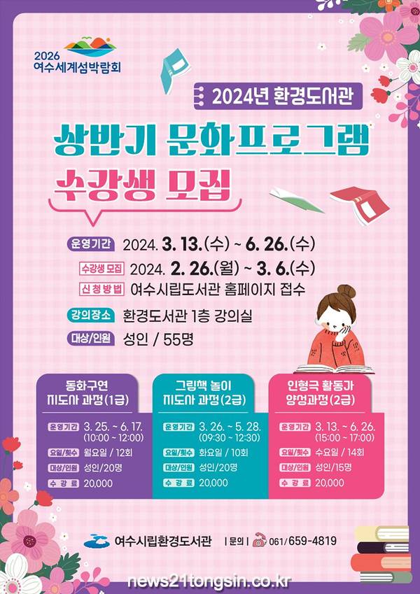 강좌별 수강료와 재료비는 개인이 별도 부담해야 하며, 참여 희망자는 오는 26일부터 여수시립도서관 홈페이지(yslib.yeosu.go.kr)에서 신청할 수 있다. 단 접수는 선착순으로 마감된다.