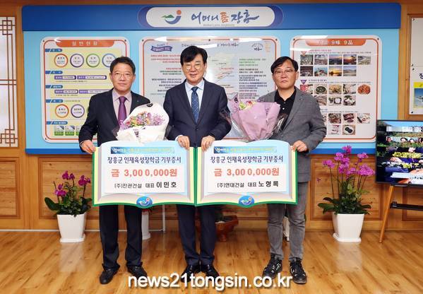 장흥군 지역 건설회사가 연이어 지역 인재양성을 위한 장학금을 기탁해 훈훈함을 전하고 있으며, (재)장흥군인재육성장학회는 21일 ㈜청림건설 100만원, ㈜대명건설 100만원, 선명건설㈜ 500만원을 기탁했다고 전했다.