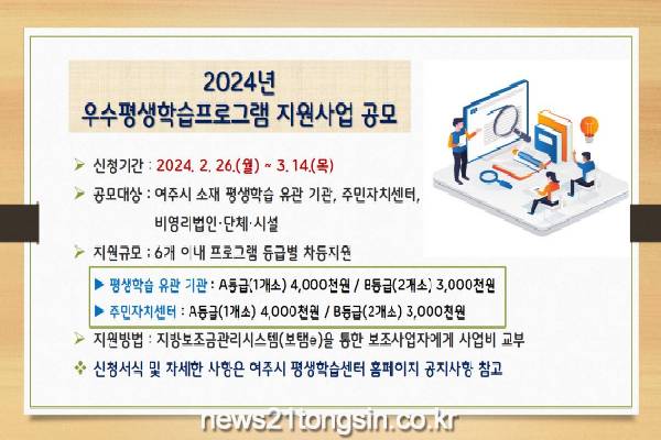 여주시 평생교육과는 여주시 평생학습기관·시설·단체의 특성화된 프로그램 발굴·지원으로 평생교육의 질적 향상 및 다양한 학습기회를 제공하여 지속가능한 평생학습문화를 확산시키기 위해 '2024년 우수평생학습프로그램 지원사업' 공모를 실시한다.
