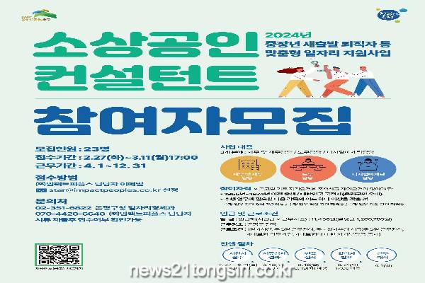 은평구는 11일까지 중장년 새출발 퇴직자 맞춤형 일자리지원 사업에 참여할 '2024년 소상공인 컨설턴트'를 모집한다고 밝혔다.