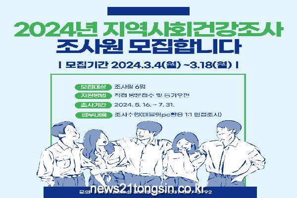 여주시보건소 건강증진과는 질병관리청, 한양대학교와 함께 공동으로 실시하는 지역사회건강조사를 수행할 조사원을 오늘(4일)부터 18일까지 모집한다고 밝혔다.
