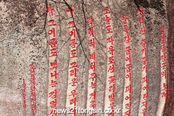 이어, "이 바위는 높이가 3.5미터 정도이고 둘레가 1.5미터 정도로 작은 바위여서 구호가 크고 웅장하게 새겨진 것은 아니었다. 하지만 양강도 구호문헌 관리국에서 해마다 주변의 나무와 풀을 제거하고 글자에 빨간색을 입혀 멀리서도 눈에 잘 띄었다."고 덧붙였다.