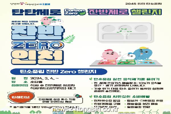인천광역시는 4일부터 시청 구내식당 이용자를 대상으로 '탄소 중립 잔반 제로(Zero) 챌린지'를 실시한다고 밝혔다.