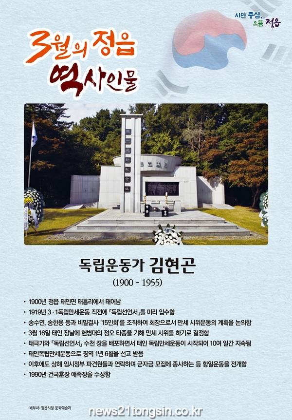 정읍시가 3·1절을 기념해 독립운동가 김현곤(1900~1955)을 이달의 정읍 역사인물로 선정했다.