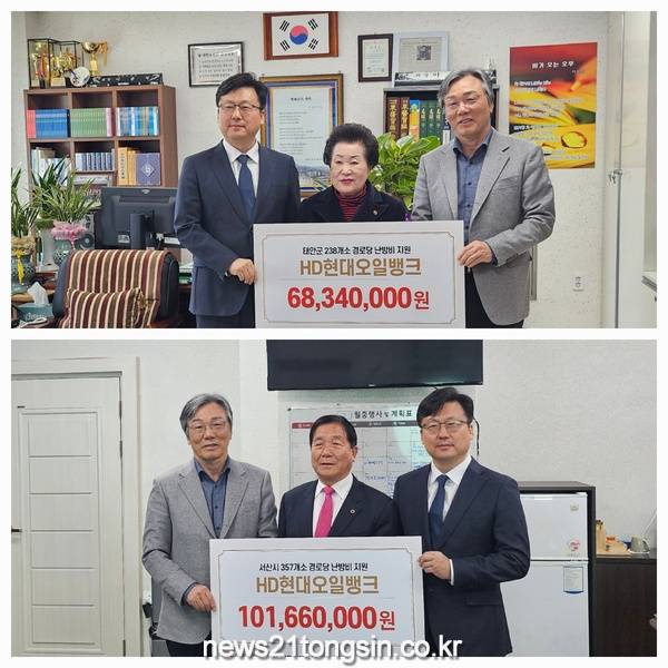 ▲ HD현대오일뱅크가 서산시.태안군 대한노인회 지회에 난방비를 지원했다.HD현대오일뱅크가 서산시•태안군 대한노인회 지회에서 난방유류비 지원 전달식을 가졌다고 8일 밝혔다. 전달식에는 서산시•태안군 대한노인회 지회장 및 HD현대오일뱅크 관계자, 사회복지공동모금회(중앙회, 충남지회) 관계자, 서산시•태안군 대한노인회 관계자 등 10여명이 참석했다.