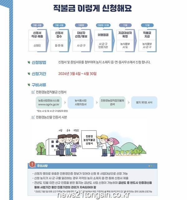 [뉴스21통신 박찬웅기자] 전라남도는 환경보전 등 농업의 공익적 기능을 높이기 위해 지원하는 친환경농업직불금 신청을 오는 4월 30일까지 받는다고 밝혔다.