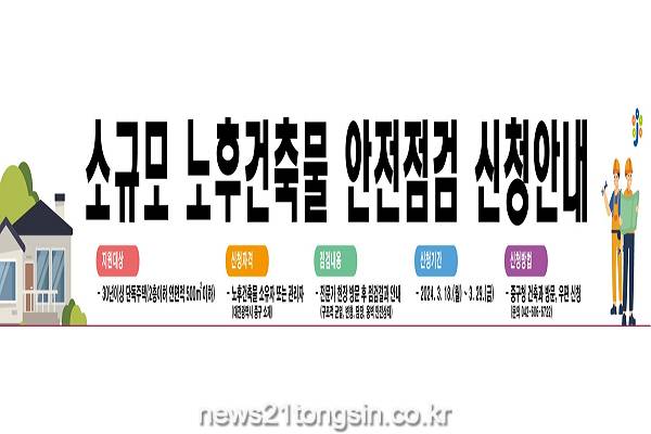 대전 중구는 소규모 노후 건축물 안전관리를 위한 안전점검을 지원한다고 10일 밝혔다. 중구는 관내 건축물 중 30년 이상 된 노후 건축물의 연면적 비율이 40%로 화재·지진 재난에 취약한 구조인 건축물들이 많아 보다 철저한 안전관리가 요구되고 있다.