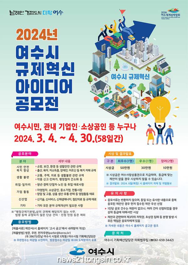 접수된 아이디어는 실행가능성과 창의성, 효율성․효과성 등 1차 소관부서 검토 후 여수시 규제개혁위원회 심의를 거쳐 6월 중 최종 수상자가 발표될 예정이다.