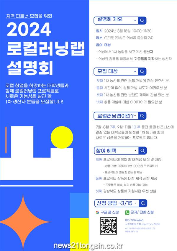 사업 추진 3년차인 올해는 의성시니어클럽사업단에서 생산한 꿀 등 의성군 1차 생산물을 활용한 창업 아이템을 발굴하여 도시청년에게는 로컬 경험을, 지역주민에게는 상품 브랜딩 기회를 제공하며 오는 18일 지역주민을 대상으로 사업설명회도 개최한다.